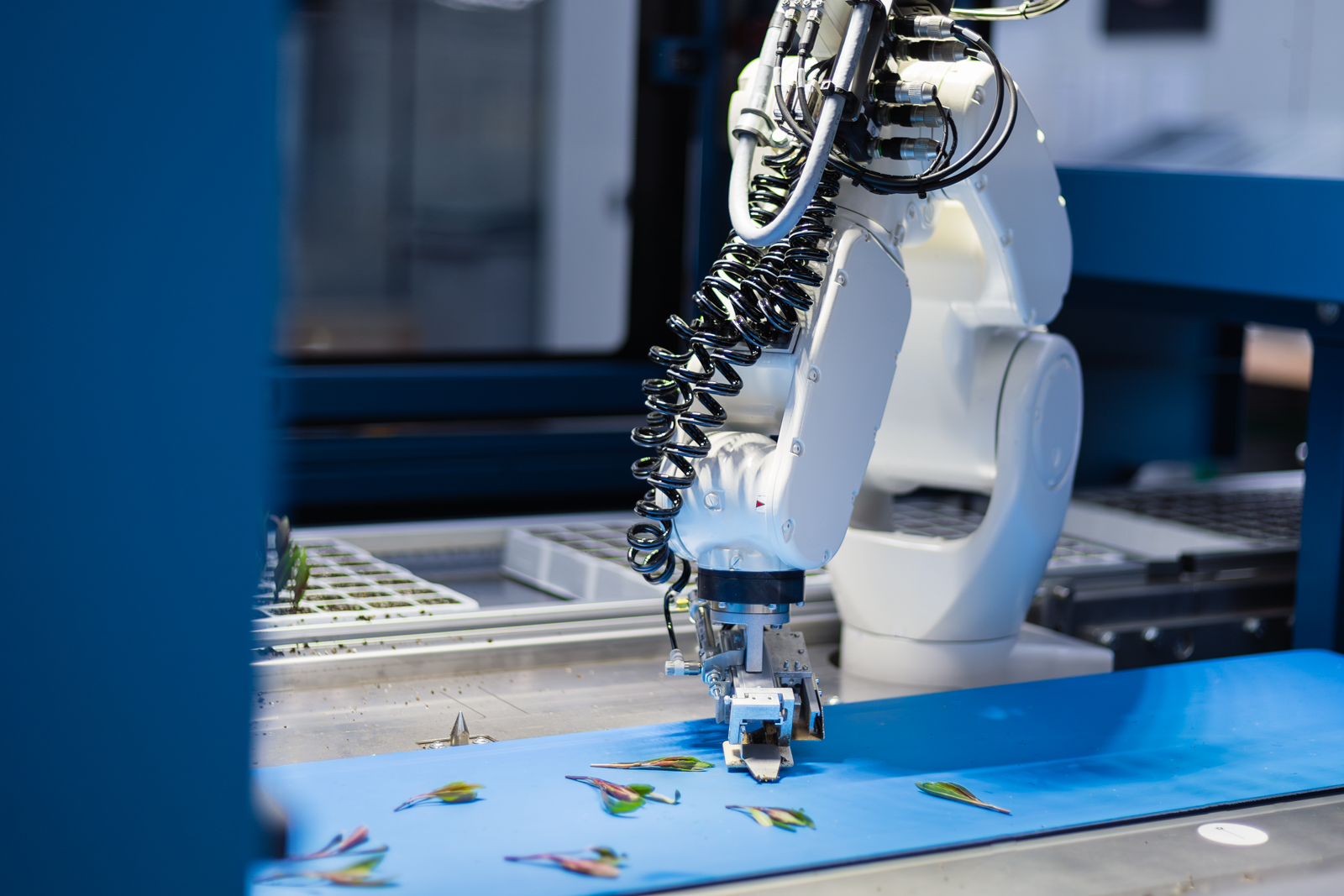 The camera system assesses the cuttings using the TTA-ISO CuttingVision system. Only qualified cuttings are then planted into the plug tray with the robotic arm. Rejected or duplicated cuttings are returned to the operator's position by a return system.