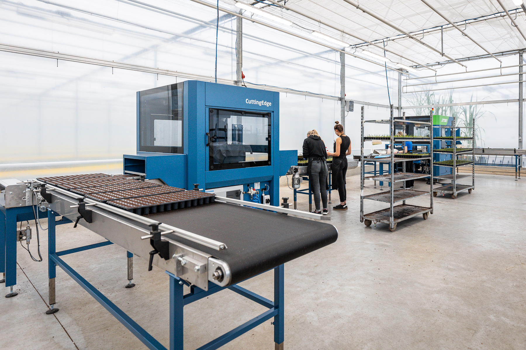 Plug trays are placed onto the in-feed chain conveyor, either manually or automatically. The chain conveyor then accurately positions the trays at their destination. Cuttings are separated manually on the machine's pick-up conveyor belt by the operator.