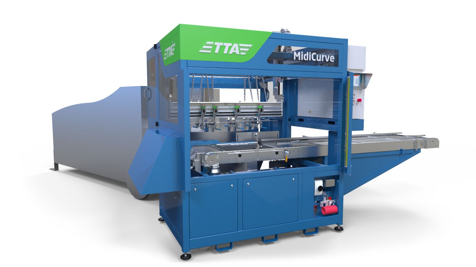 The design of the MidiCurve incorporates the possibility of operating over both a circular pot filler as well as transplanting over a conveyor belt for packs.