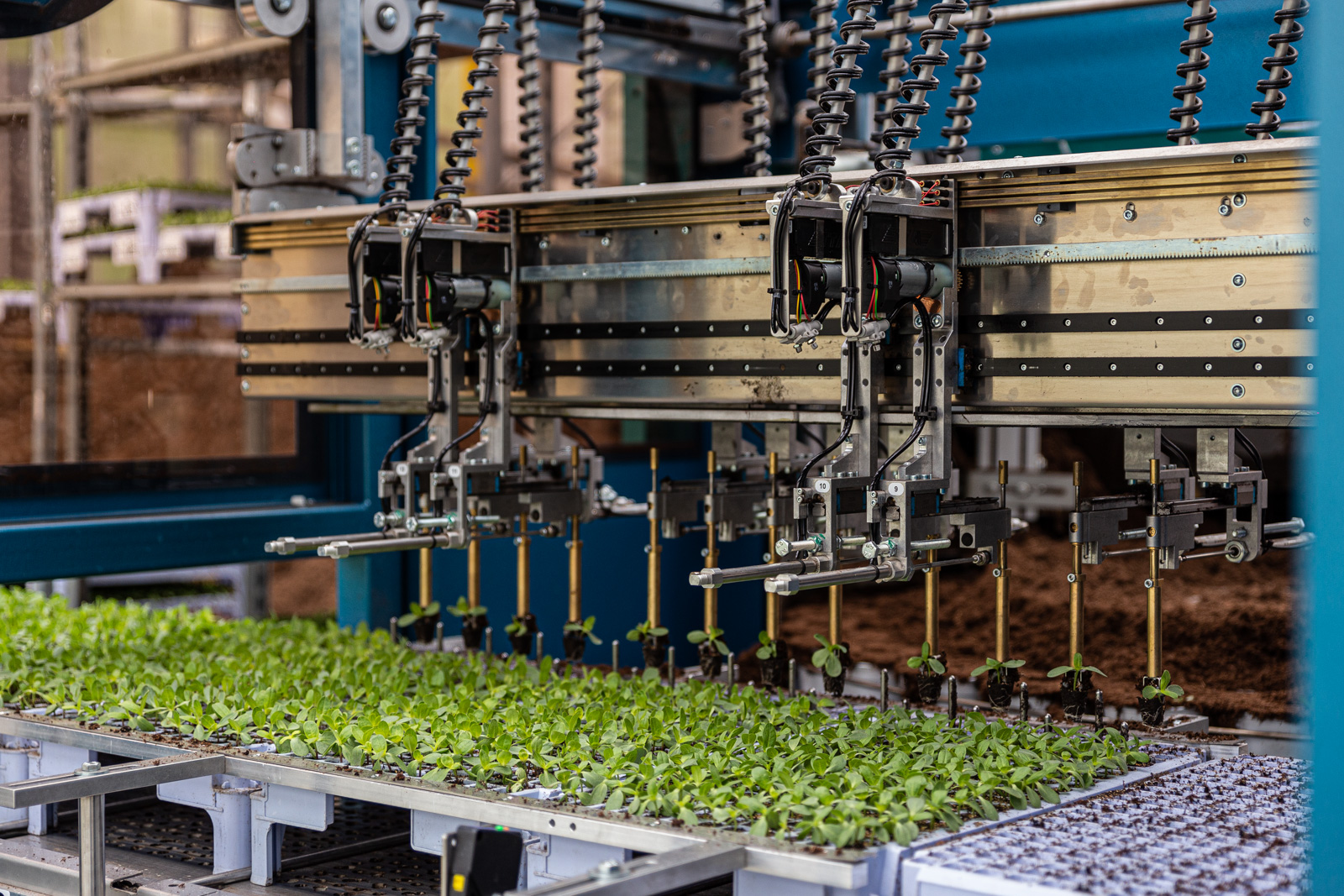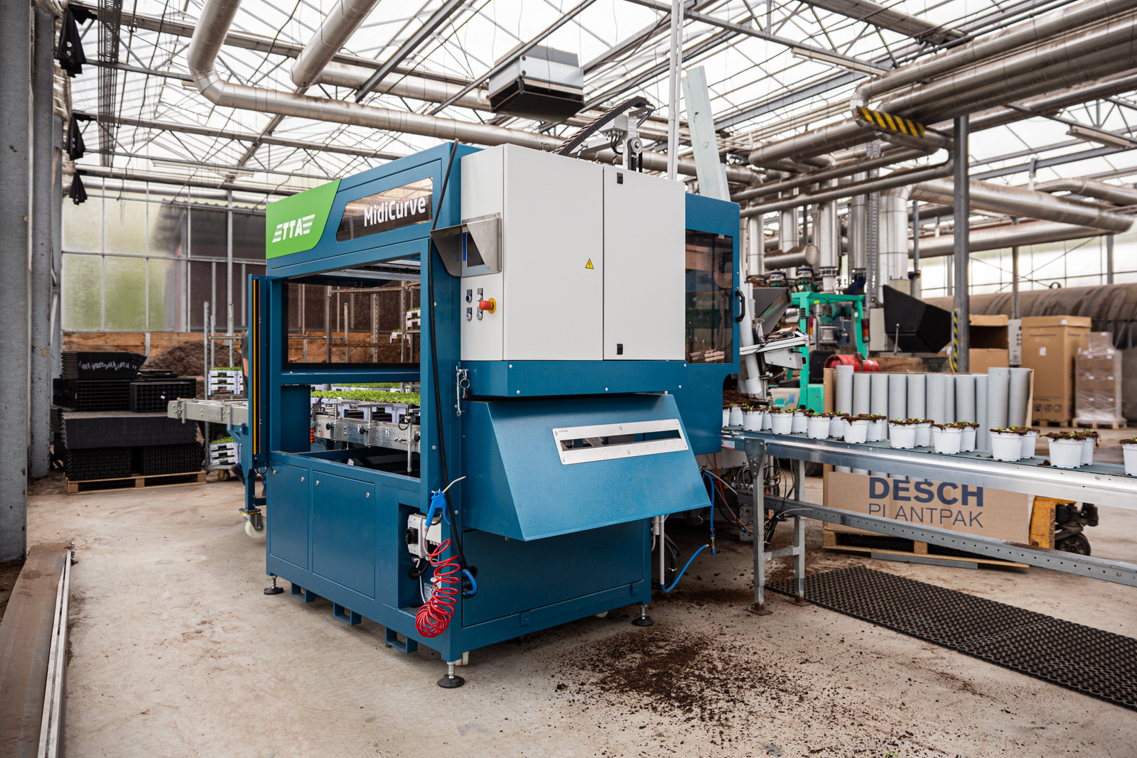 The MidiCurve is available in capacities ranging from 3.000 up to 8.000 plants per hour, depending on the pot filler and the number of plants per pot. The curve functionality can be disabled, so the MidiCurve can also be utilized for transplanting into trays, packs, and shuttle trays. The MidiCurve offers an easy-to-use user interface with built-in self-diagnosis.