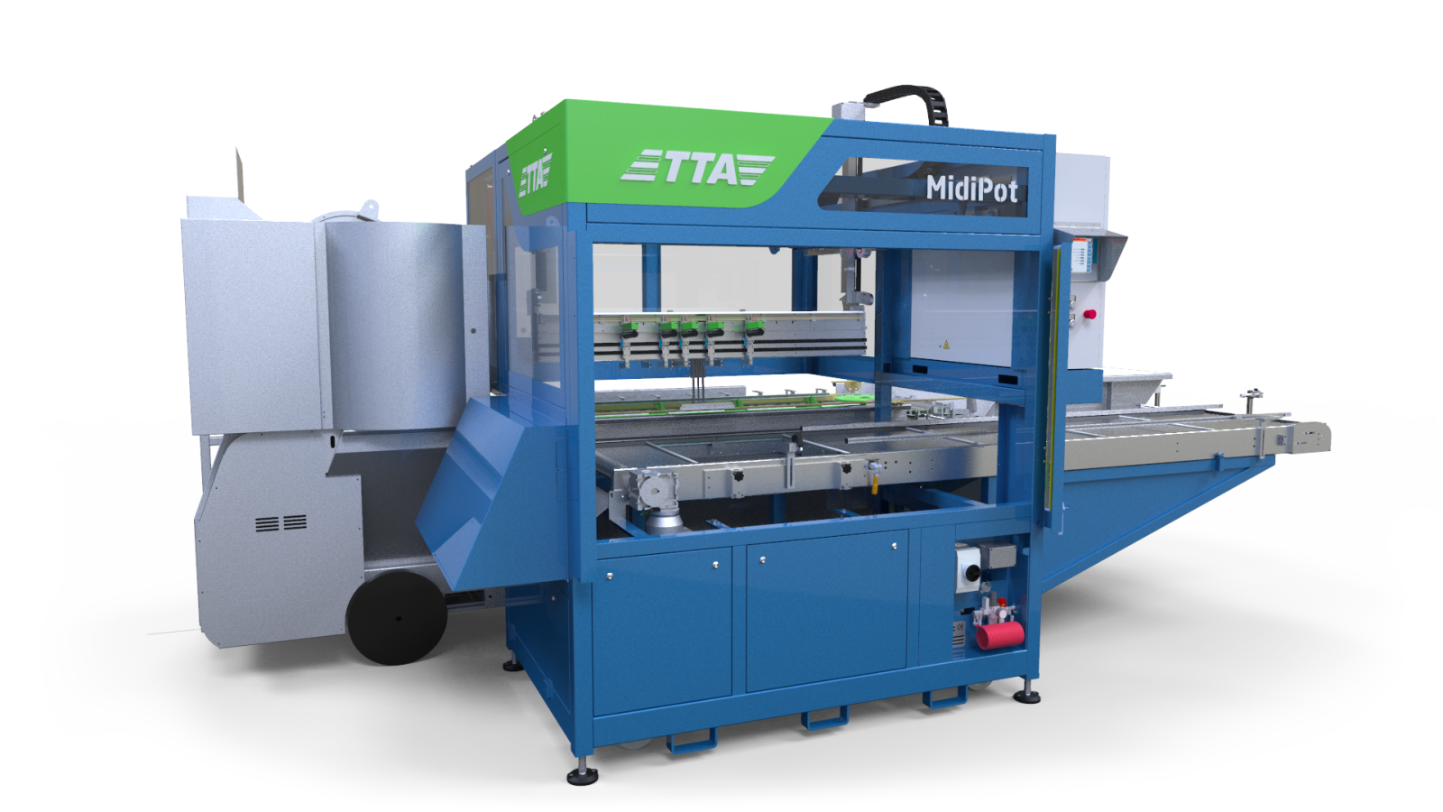 The MidiPot plants in a linear potting machine. Its design incorporated the possibility to operate over both a conveyor belt for packs and operation over different brands of linear pot fillers.