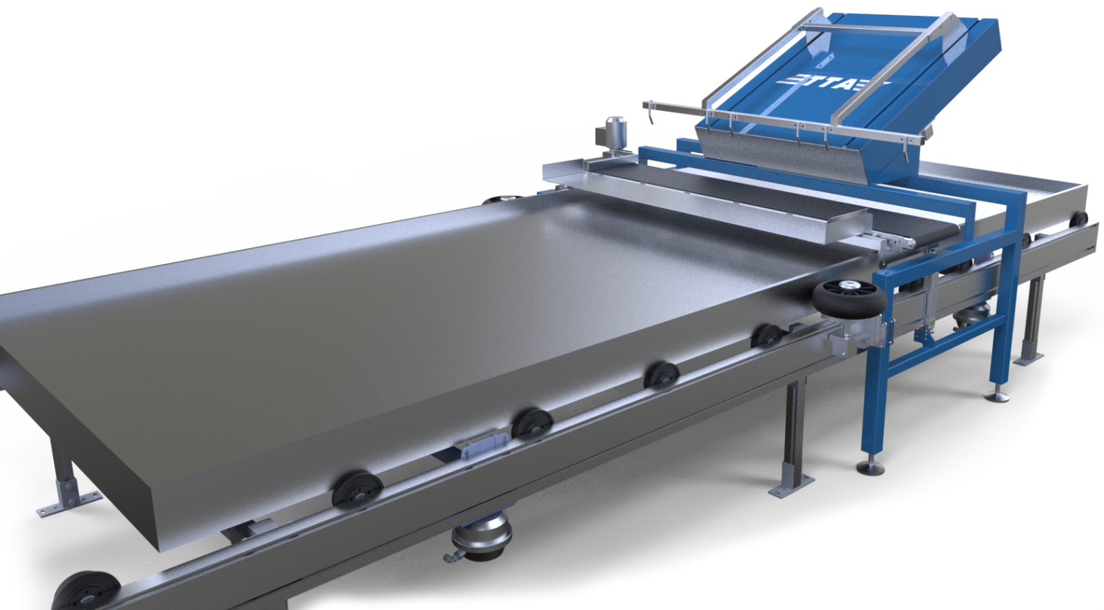 At the same time, flats/trays are placed through a buffer belt and a stepper belt combination. When sufficient flats/trays are positioned, the conveyor belt will tilt, and a slider bar will push the flats/trays on the mobile table or trolley.