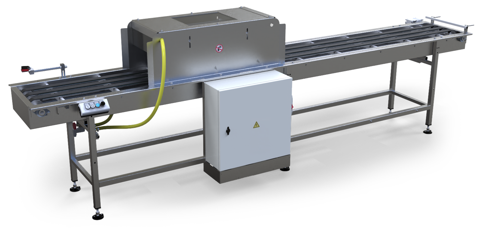 A high-quality conveyor system in a stainless-steel drip bin.