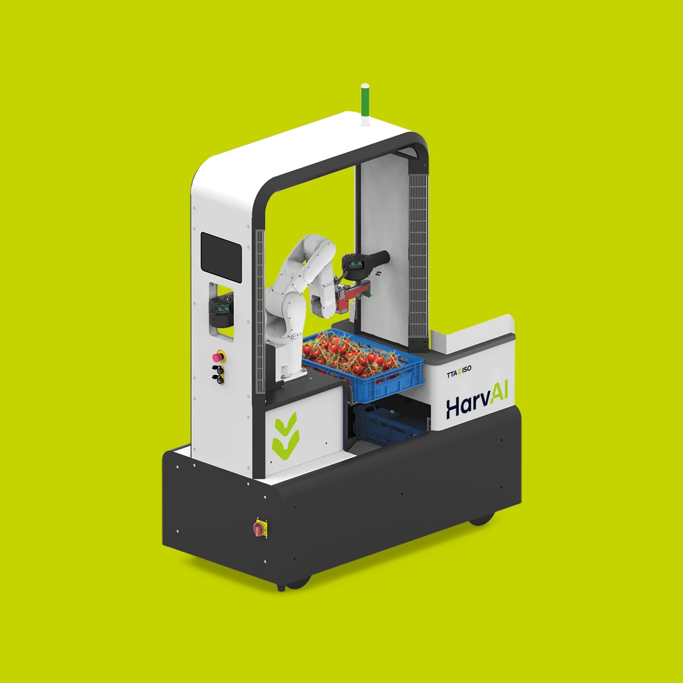 The HarvAI harvesting robot integrates precise ripeness detection, intelligent navigation, and seamless compatibility with existing greenhouse infrastructure. With a cycle time of 450 vines per hour and the capability for one operator to oversee multiple harvesting robots, it maximizes efficiency while minimizing crop damage.